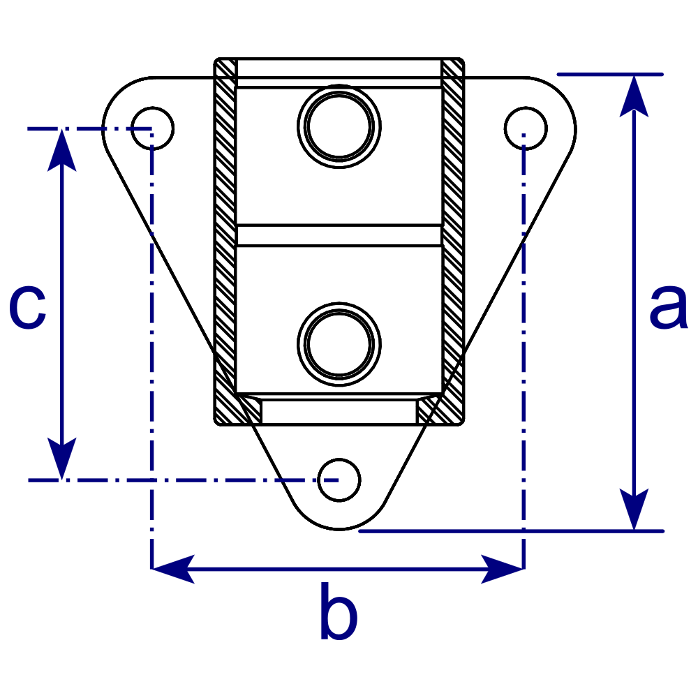 Side palm-type fitting, often used to attach guardrail uprights to walls, staircases and ramps. In standard form, the tube cannot pass through the bottom of the fitting, although the fitting may be modified to accommodate this at extra cost (with loss of use of bottom bolt hole).