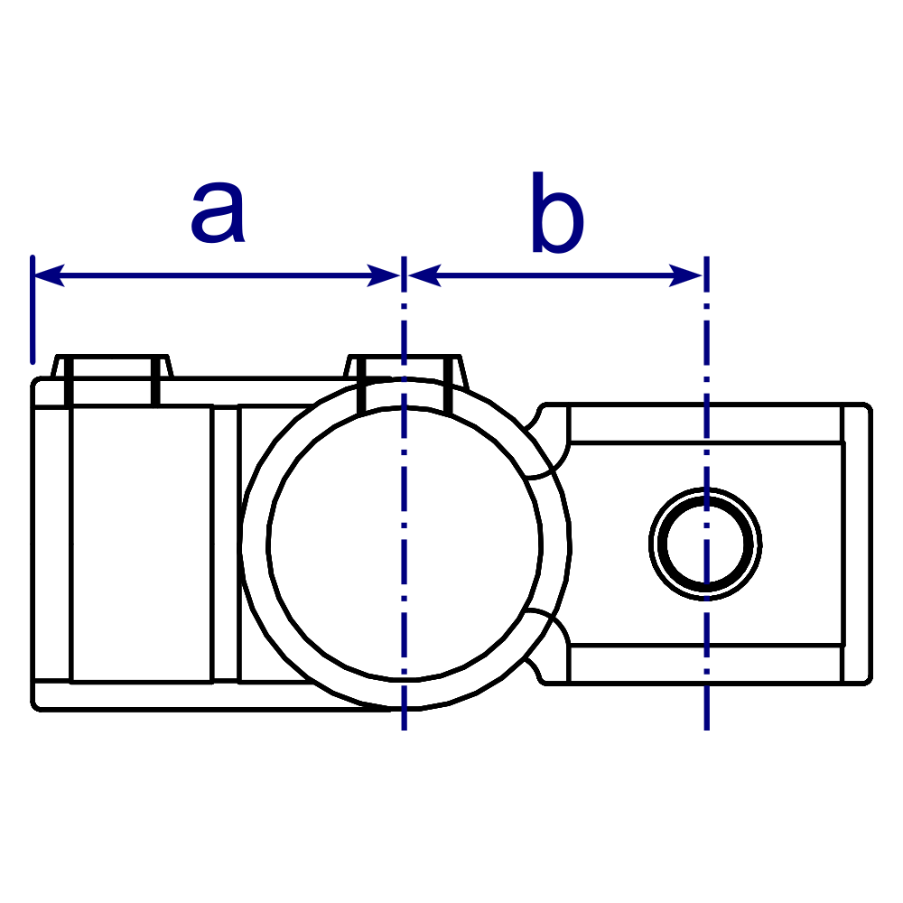 This combined tee and crossover fitting is often used in racking and similar structures, the fitting allows both uprights and front and rear horizontal rails to be continuous. It is usually preferable for the upright to be on the outside of the structure (as per the photo) for maximum stability. The through tubes cannot be joined within the fitting.