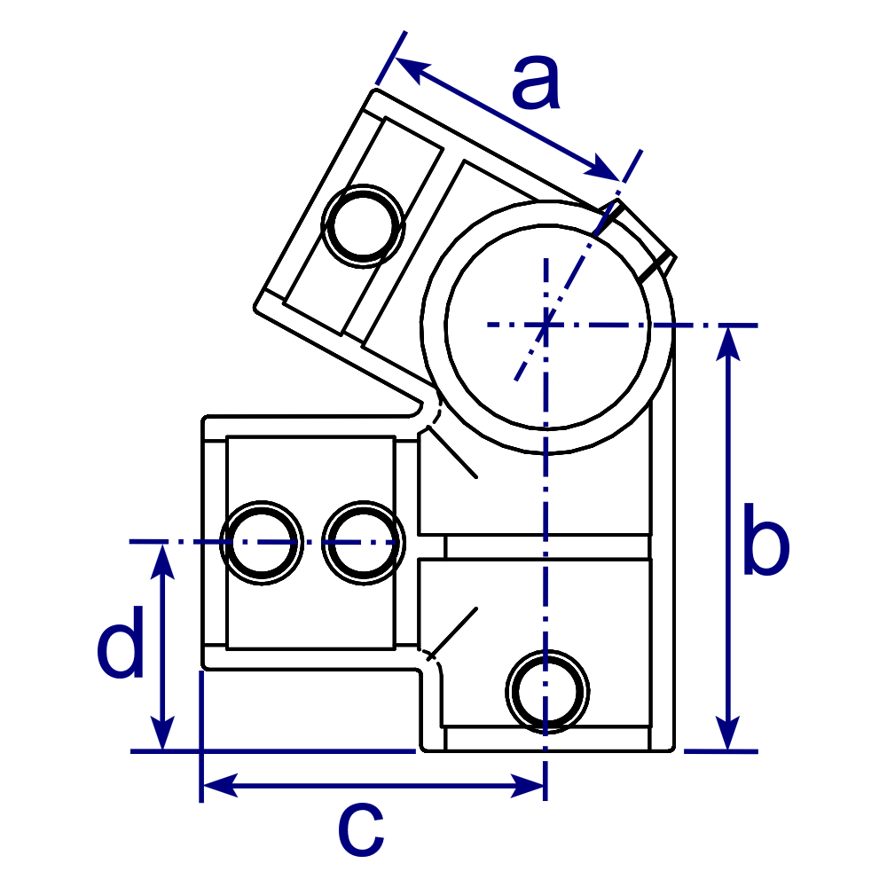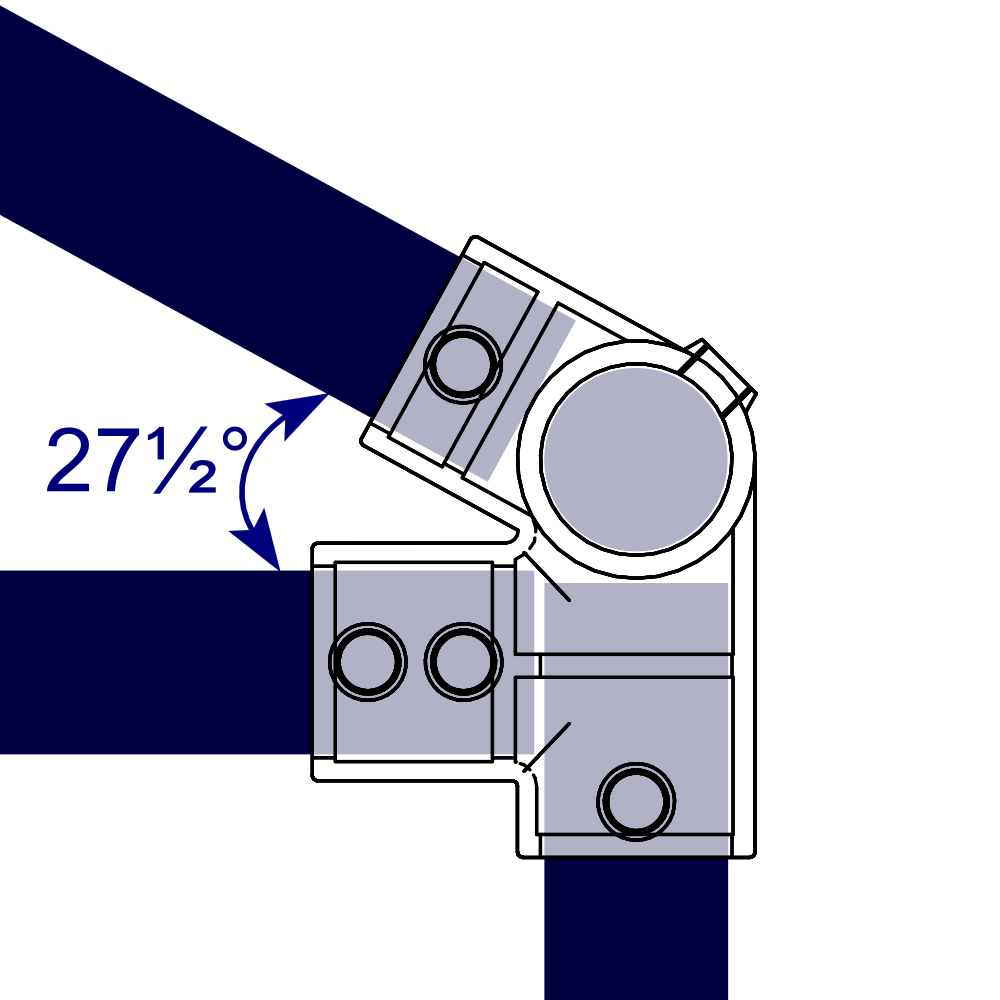 Usually used to form roof structures in conjunction with type 191Interclamp Fitting, with an angle of 27.5 degrees. The horizontal eaves tube running longitudinally with the roof may be joined within the fitting (there are two setscrews acting on this tube, which are obscured in the photo).